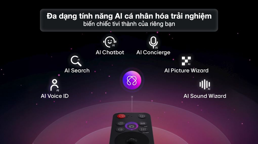 LG cũng trang bị loạt tính năng AI đa dạng như AI Agent, AI Concierge, AI Chatbot, AI Search, AI Picture Wizard và AI Sound Wizard, giúp cá nhân hóa trải nghiệm, gợi ý nội dung phù hợp và tối ưu cả hình ảnh lẫn âm thanh theo nhu cầu thực tế. Nhờ đó, chiếc tivi này không chỉ là trung tâm giải trí mà còn là trợ lý thông minh trong không gian sống hiện đại.