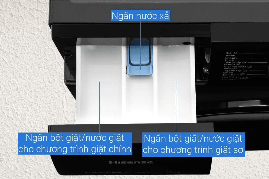 Hộc chứa chất tẩy rửa được chia làm ba ngăn riêng, giữ cho hương không bị trộn lẫn mùi và phát huy đúng công dụng từng loại. Ngăn lớn bên trái dùng cho bột giặt hoặc nước giặt của chu trình chính, tăng hiệu quả làm sạch. Ngăn nhỏ màu xanh ở giữa chứa nước xả, giúp làm mềm vải và lưu hương thơm. Ngăn bên phải ngoài cùng dành cho bột giặt hoặc xà phòng ở bước giặt sơ, hỗ trợ loại bỏ vết bẩn ban đầu trước tiến đến chu trình giặt chính.